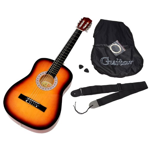 «Guitare classique acoustique de la marque" "ts Musique Fidelity" "avec un Klassikbesaitung et une finition à haute brillance en sunburst avec une bordure noire sur le plafond. L'guitare est faite de bois de tonalité stratifiés, ces bois ton faire un tour, un son chaud et une très bonne réponse . Cette guitare est un instrument d'entrée de gamme pour les adultes et les adolescents (160 cm la taille du corps) en qualité standard pas cher de démarrer sans un gros investissement avec les jeux et voir si vous aimez jouer de la guitare -. sûr, c'est que cet ensemble est idéal La guitare est offert avec un sac, bracelet et un ensemble de cordes de rechange classiques Si vous toujours à la recherche de quelque chose d'autre -., nous avons une grande sélection de tailles différentes de la guitare et de qualités dans notre magasin. Détails sur le produit · Corps en tilleul placage de bois · Cou: Pont de bouleau: érable laqué · Touche: bois noirci · Taille: environ 97 cm · Diapason: 63 cm · Longueur du corps: environ 46 cm, largeur 35 cm · Largeur à la première case: environ 4.7 cm · Deux boutons pour la fixation de la sangle (sur le cou et sur ??le terrain) · 18 frettes · Ouvrir le mécanisme avec les remous blancs · Klassikbesaitung, cordes E, A et D emballés avec du nickel · Poids 1,5 kg Contenu de la livraison · Description fort guitare · Hydrofuge sac noir de la guitare avec une poche zippée sur le devant, le dos avec deux sangles de sac à dos réglables et une poignée de transport · Sangle de guitare réglable · Un ensemble de classiques deux pioches et des cordes de rechange · Stand Guitar pas inclus dans la livraison "